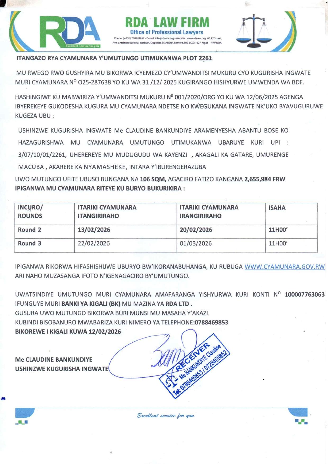 Nyamasheke: Cyamunara y’umutungo utimukanwa ubaruye kuri UPI: 3/07/10/01/2261 (Sqm: 106); mu murenge wa Macuba, Akagari ka Gatare, Umudugudu wa Kayenzi