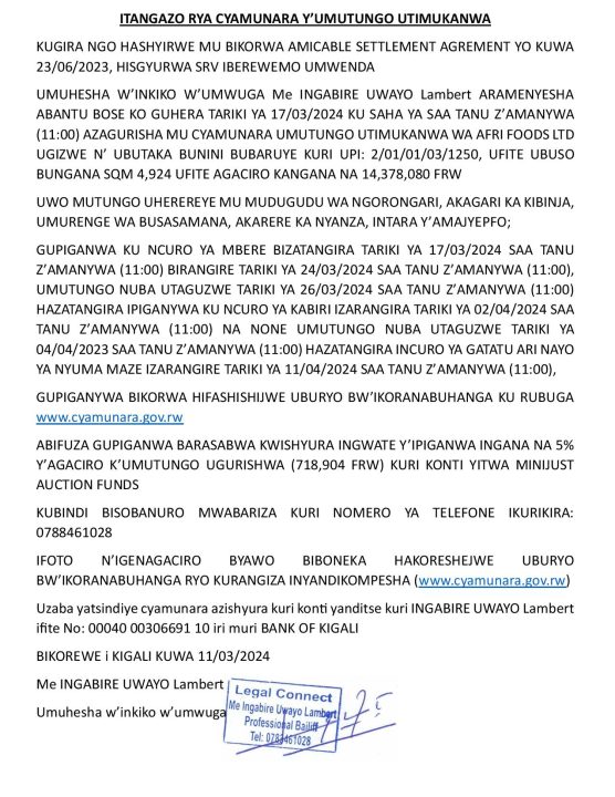 Nyanza: Cyamunara y’ubutaka bwa AFRIFOODS Ltd, ku ncuro ya 2, bubaruye kuri UPI: 2/01/01/03/1250 (4,294 Sqm); mu murenge wa Busasamana, Akagari ka Kibinja, Umudugudu wa Ngorongari