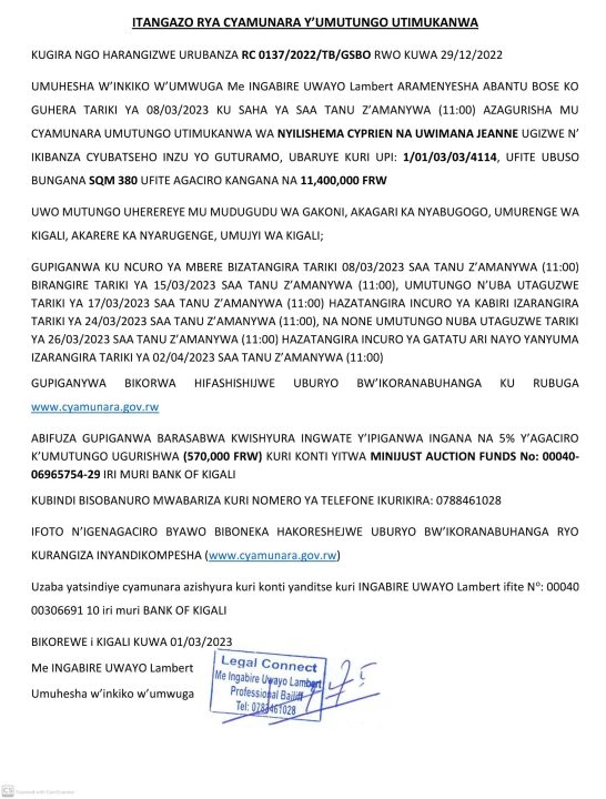 Nyarugenge: Cyamunara y’inzu yo guturamo ibaruye kuri UPI: 1/01/03/03/4114, Umurenge wa Kigali, Akagari ka Nyabugogo, Umudugudu wa Gakoni