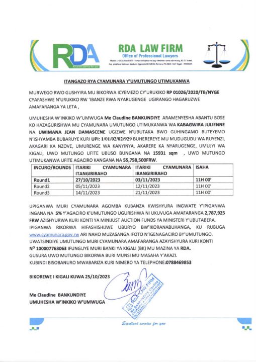 Nyarugenge: Cyamunara y’ubutaka bwo guhingamo burimo n’ishyamba bubaruye kuri UPI: 1/01/02/02/929 (15931 Sqm); mu murenge wa Kanyinya, Akagari ka Nzove, Umudugudu wa Ruyenzi