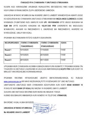 Nyarugenge: Cyamunara y’umutungo ugizwe n’ikibanza cyubatsemo inzu ubaruye kuri UPI: 1/01/10/04/300 (Sqm 399); mu murenge wa Rwezamenyo, Akagari ka Rwezamenyo II, Umudugudu w’Amahoro
