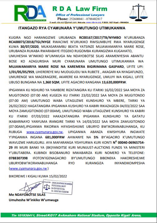 Nyarugenge: Cyamunara y’umutungo utimukanwa mu kagari ka Nyagafunzo, Umurenge wa Mageragere UPI: 1/01/05/05/959
