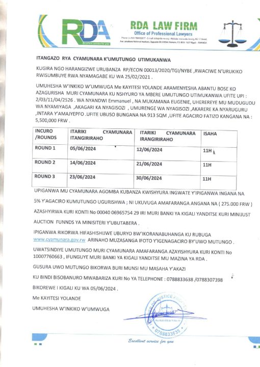 Nyaruguru: Cyamunara (ku ncuro ya mbere) y’umutungo utimukanwa ubaruye kuri UPI: 2/03/11/04/2526 (913 Sqm); mu murenge wa Nyagisozi, Akagari ka Nyagisozi, umudugudu wa Nyamiyaga