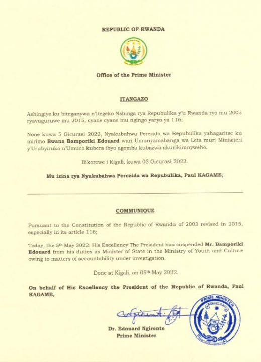 Itangazo dukesha Ibiro bya Minisitiri w’Intebe ryo ku wa 5 Gicurasi 2022, niryo ryanyuzemo ubutumwa buhagarika muri Guverinoma Bamporiki Edouard.