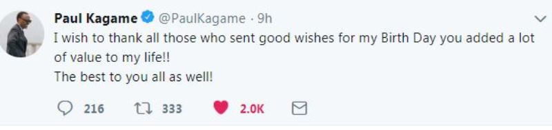 Perezida Kagame abinyujije ku rukuta rwe rwa twitter, yashimiye abantu bose bamwifurije isabukuru nziza n’ibyiza byinshi, na we abifuriza ko byabageraho.