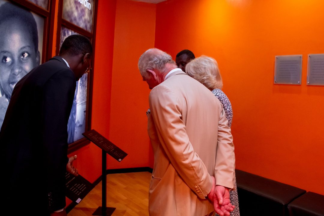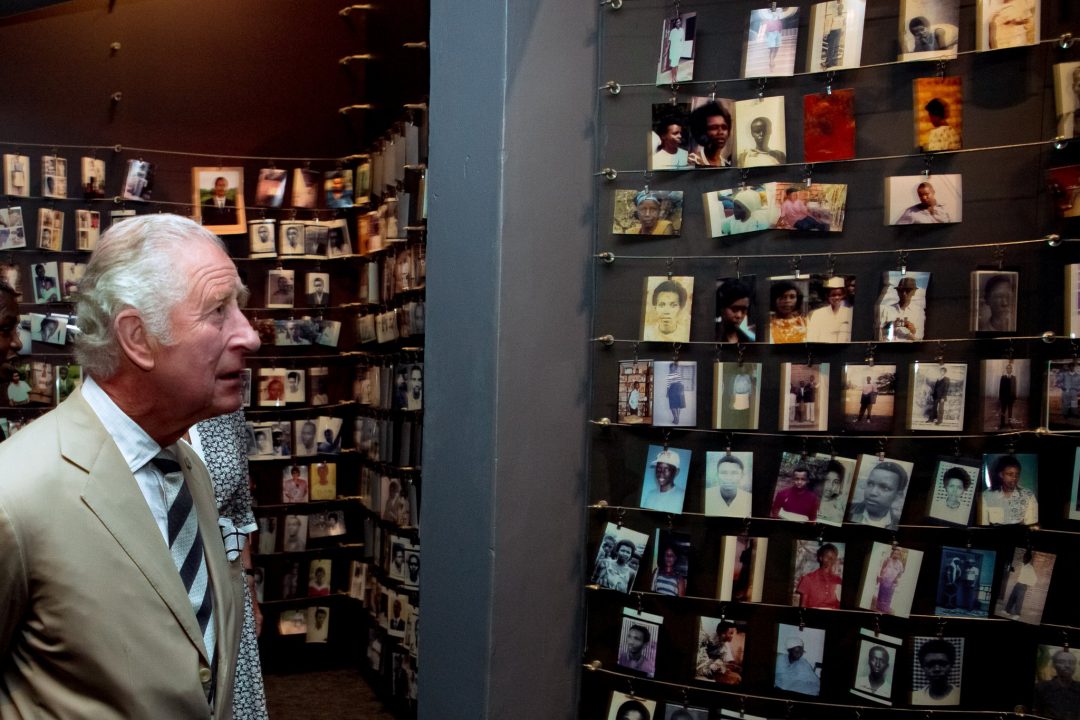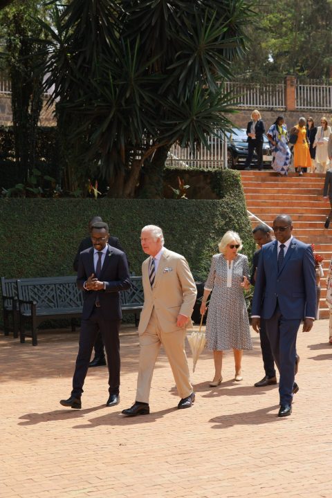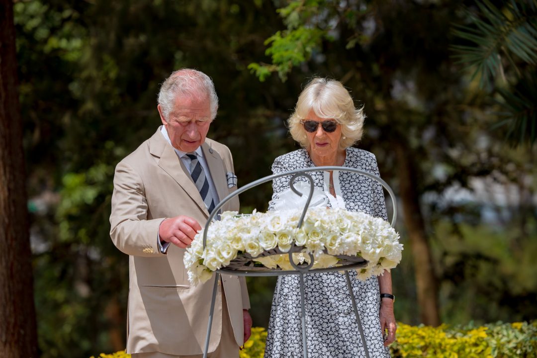 Mbere yo kwakirwa na Perezida Paul Kagame na Madame Jeannette Kagame, Igikomangoma cya Wales, Charles Philip n’umugore we Camilla, bunamiye abatutsi bishwe muri Jenoside yakorewe Abatutsi bashyinguye mu Rwibutso rwa Jenoside rwa Kigali ku Gisozi.