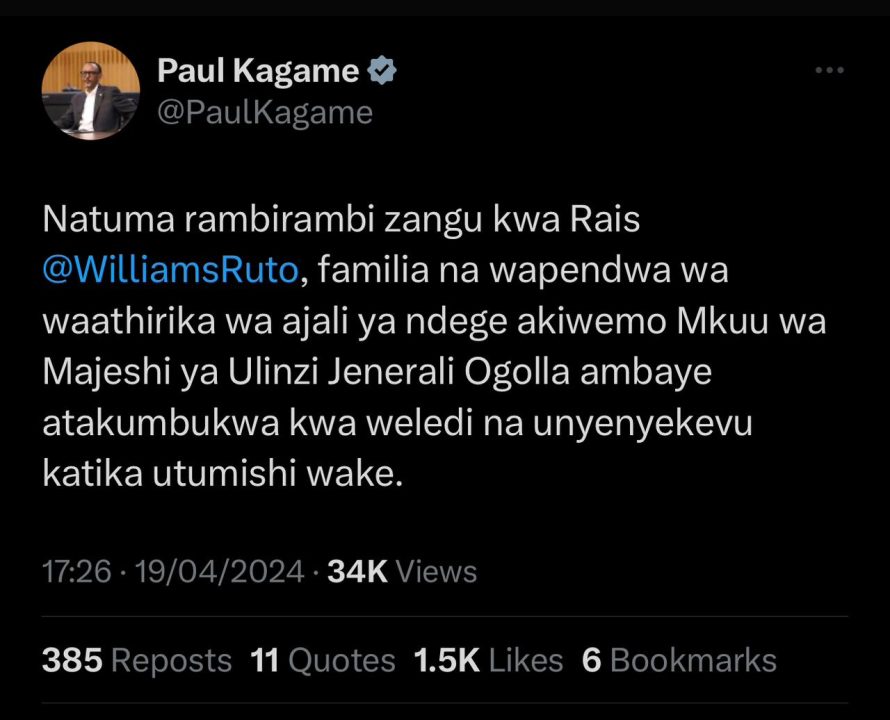 Napenda nichukue fursa hii kwa niaba ya wanyarwanda wasiyojua lugha hii ya Kiswahili ko Nyakubahwa Perezida Paul Kagame yoherereje mugenzi we ubutumwa bwo kumufata mu mugongo kubera urupfu rw’Umukuru w’ingabo za Kenya na bagenzi be baguye mu mpanuka y’indege ya kajugujugu ejo hashize. Natwe twifatanyije na bo ku mutima. Uwiteka abahoze kandi abahumurize. No mu kiriyo ntituri insina ngufi ” migomba mifupi “
