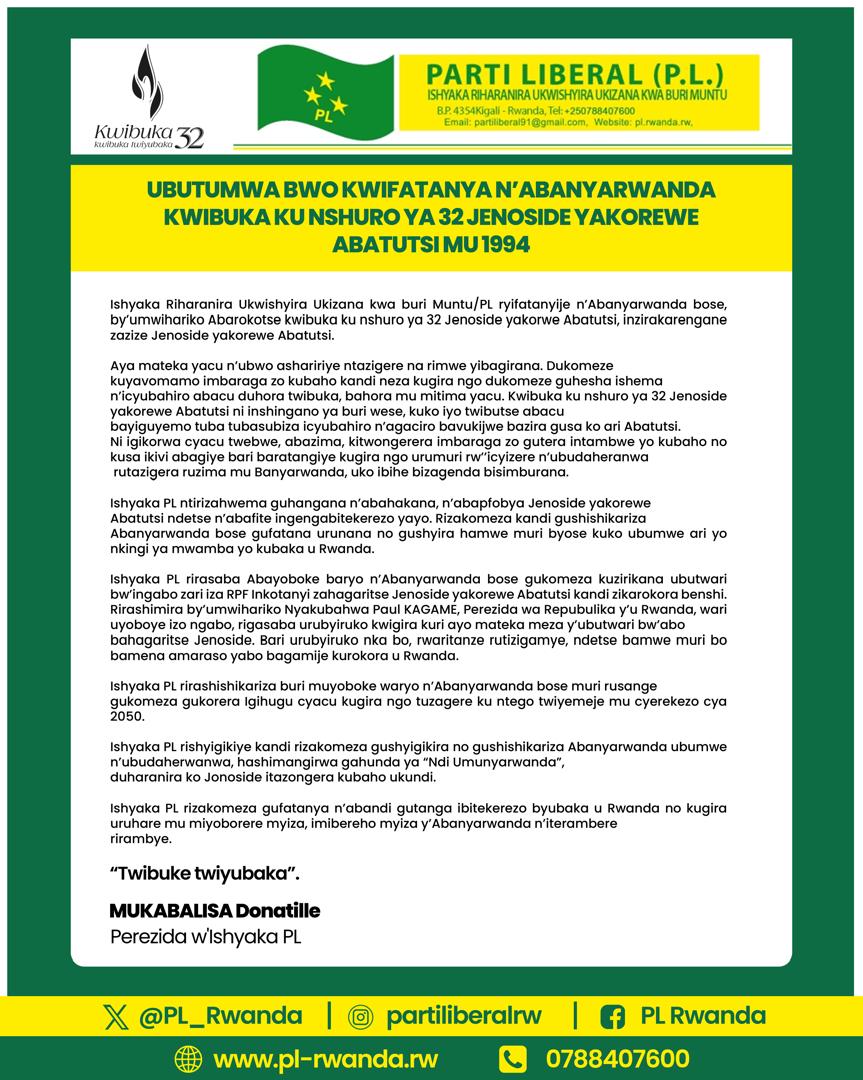 Ishyaka riharanira Ukwishyira Ukizana kwa Muntu (PL), ryatanze ubutumwa bwo kwifatanya n’abanyarwanda ndetse n’Isi yose Kwibuka ku nshuro ya 32 Jenoside yakorewe Abatutsi mu 1994.