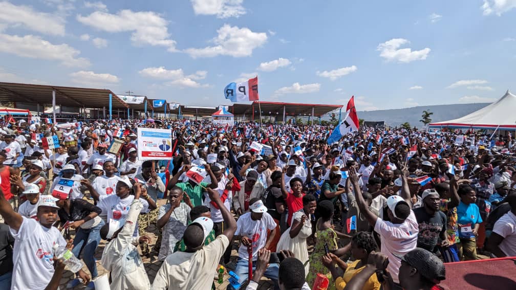 An estimated over 10,000 supporters of the RPF gathered at the campaign site at Gitwaza stadium dressed in party colors, red, white and blue, sang patriotic songs as they waved party flags.