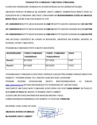 Ruhango: Cyamunara y’imitungo itimukanwa ibaruye kuri UPI: 2/06/02/05/6732; UPI: 2/06/02/05/3152 na UPI: 2/06/02/05/3694 mu murenge wa Byiamana, Akagari ka Muhororo