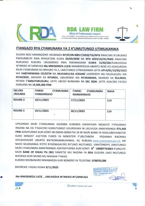 Rulindo: Cyamunara ya 2 y’umutungo utimukanwa ubaruye kuri UPI: 4/01/13/02/1013 (501 Sqm); mu murenge wa Ntarabana, Akagari ka Kiyanza, Umudugudu wa Nyagisozi