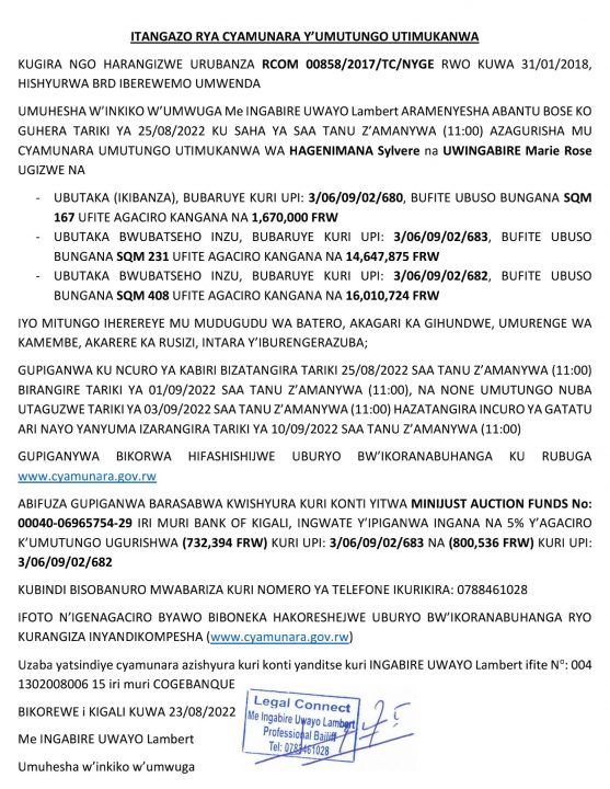 Rusizi: Cyamunara Mu Kagari Ka Gihundwe, Umurenge Wa Kamembe. Ikibanza UPI: 3/06/09/02/680; Inzu UPI: 3/06/09/02/683; Inzu: 3/06/09/02/682