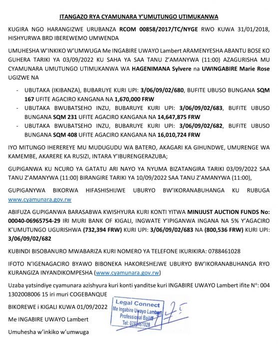 Rusizi: Cyamunara mu Kagari ka Gihundwe, Umurenge wa Kamembe. Ikibanza UPI: 3/06/09/02/680; Inzu UPI: 3/06/09/02/683; Inzu: 3/06/09/02/682