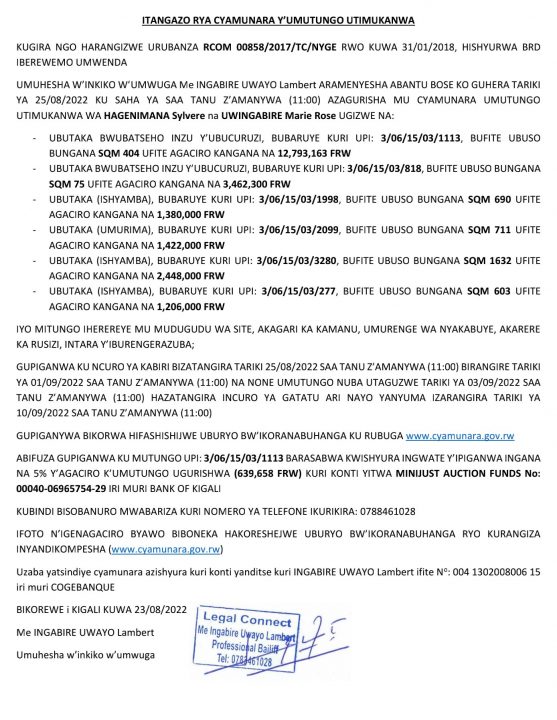 Rusizi: Cyamunara Mu Kagari Kamanu, Umurenge Wa Nyakabuye; Inzu Y’ubucuruzi UPI: 3/06/15/03/1113; Inzu Y’ubucuruzi UPI: 3/06/15/03/818; Ishyamba UPI: 3/06/15/03/1998; Umurima UPI: 3/06/15/03/2099; Ishyamba UPI: 3/06/15/03/3280; Ishyamba UPI: 3/06/15/03/277