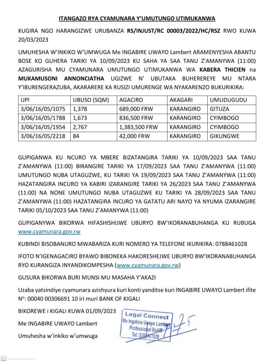 Rusizi: Cyamunara y’imitungo itimukanwa ibaruye kuri UPI: 3/06/16/05/1075; UPI: 3/06/16/05/1788; UPI: 3/06/16/05/1954; UPI: 3/06/16/05/2218; Umurenge wa Nyakarenzo
