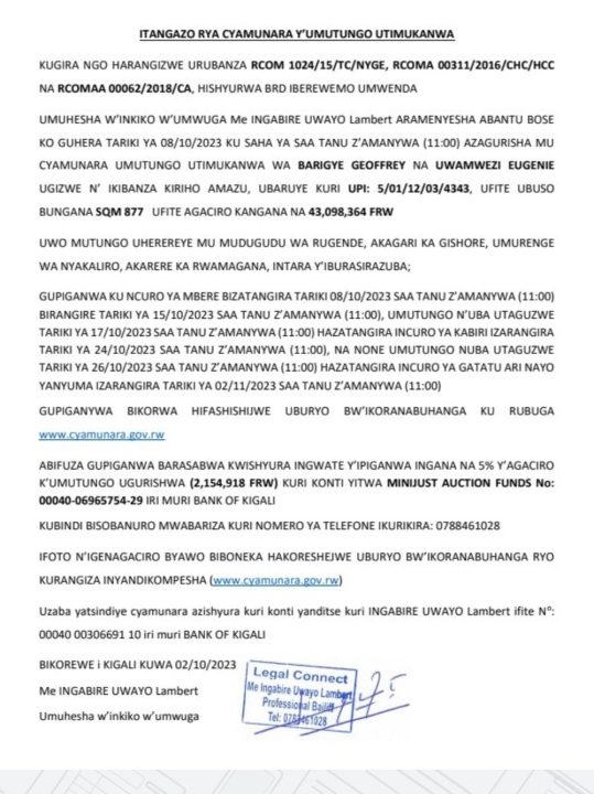 Rwamagana: Cyamunara y’ikibanza kirimo inzu kibaruye kuri UPI: 5/01/12/03/4343; mu murenge wa Nyakariro, Akagari ka Gishore, Umudugudu wa Rugende