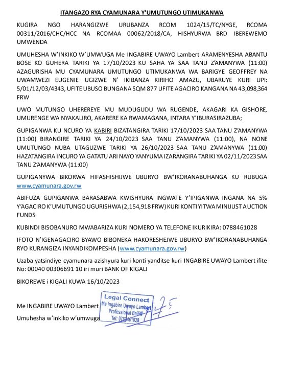 Rwamagana: Cyamunara y’ikibanza kirimo inzu kibaruye kuri UPI: 5/01/12/03/4343 (Sqm 877); mu murenge wa Nyakariro, Akagari ka Gishore, Umudugudu wa Rugende