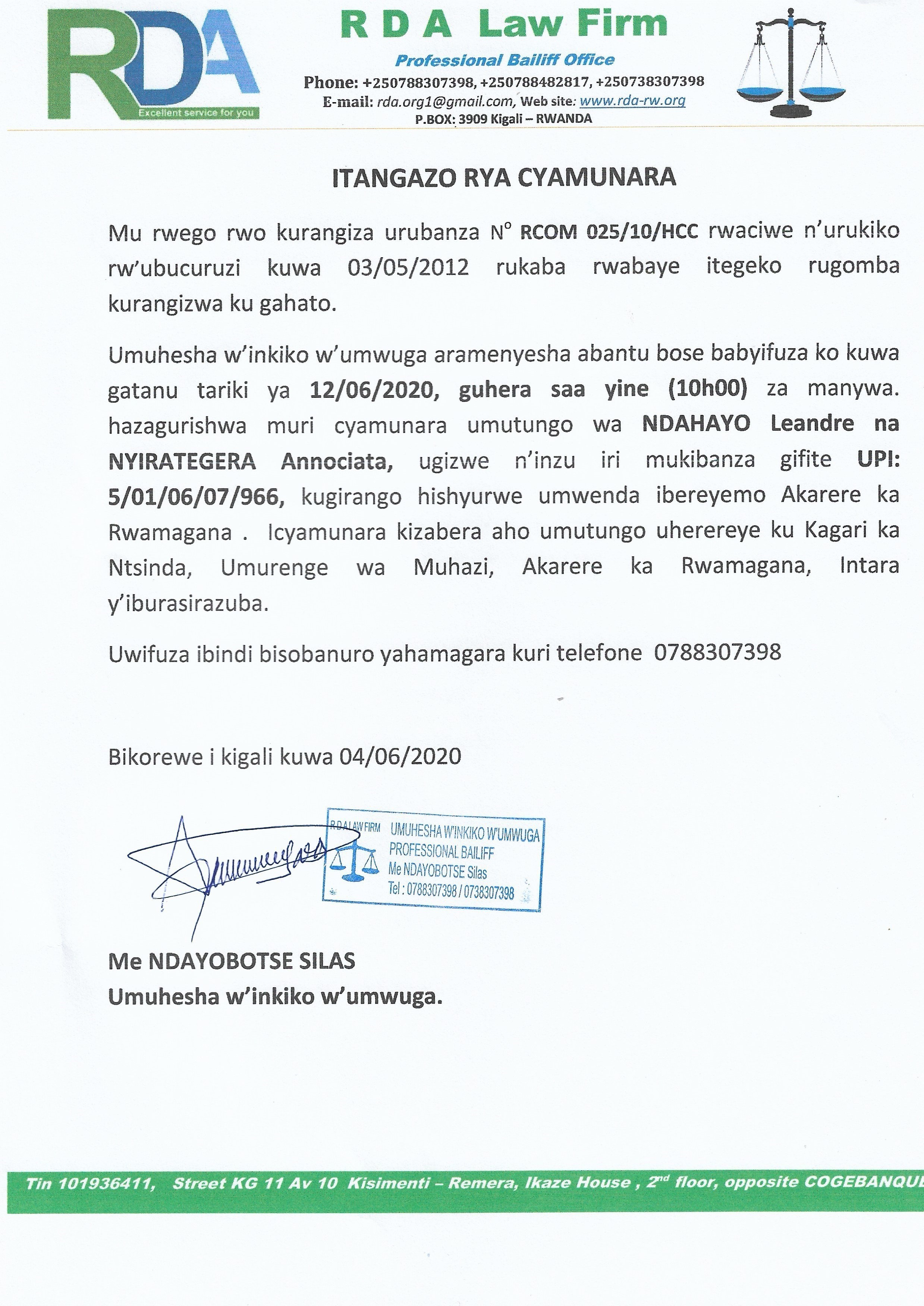 Gasabo: Cyamunara y’umutungo utimukanwa ugizwe n’ikibanza cyubatsemo inzu kibaruye kuri UPI: 1/02/10/04/720 (Sqm 643) mu murenge wa Kinyinya, Akagari ka Murama, mu mudugudu wa Binunga