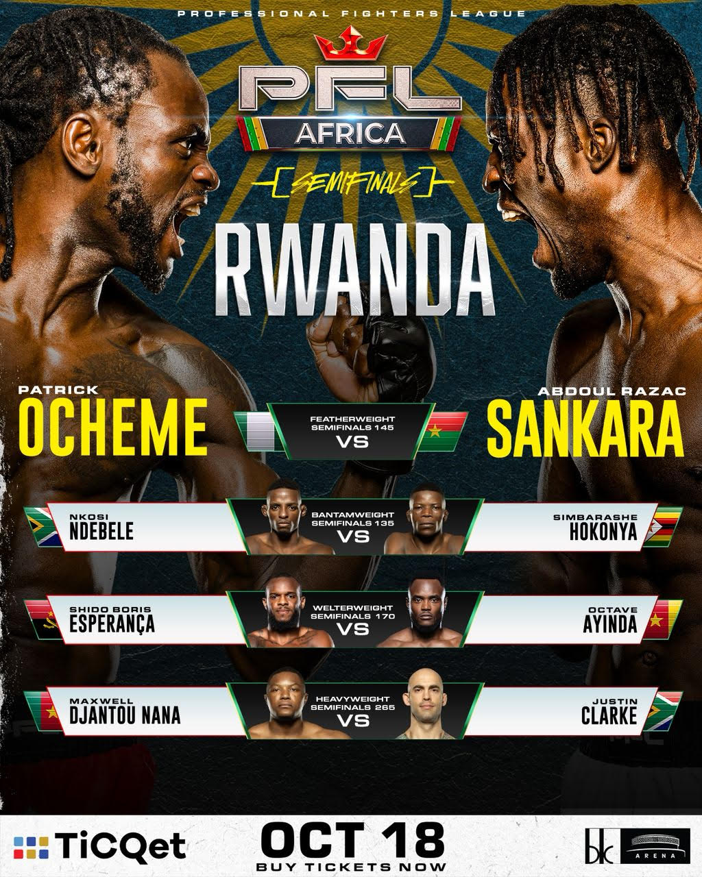 The Professional Fighters League (PFL) has announced the full lineup for the first-ever PFL Africa Semi-finals, set for Saturday, October 18, at BK Arena in Kigali, Rwanda.