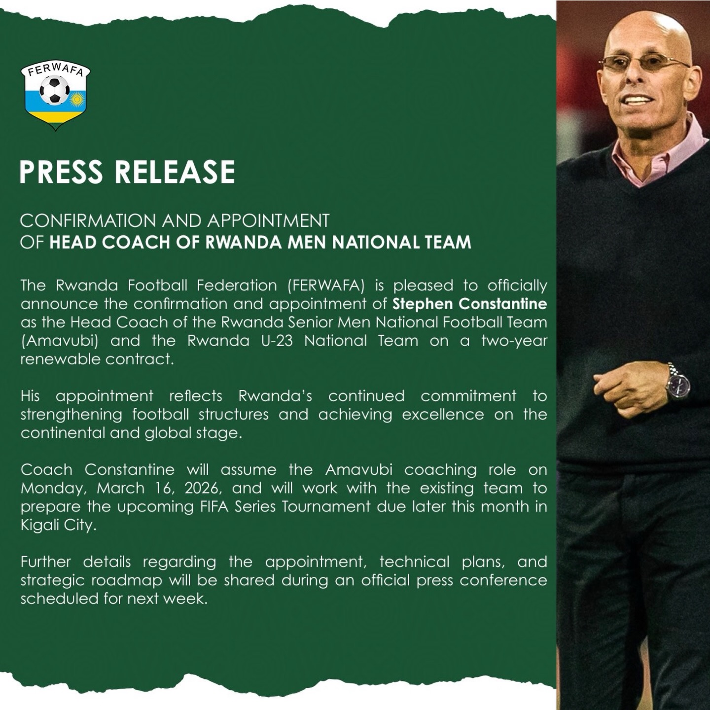 Ishyirahamwe ry’Umupira w’Amaguru mu Rwanda, Rwanda Football Federation, ryatangaje ko umutoza w’umwongereza Stephen Constantine yagizwe umutoza mukuru w’Ikipe y’Igihugu y’Abagabo, Rwanda national football team. Uyu mutoza kandi azaba anatoza Ikipe y’Igihugu y’Abatarengeje imyaka 23 mu gihe cy’imyaka ibiri iri imbere, hashingiwe ku musaruro azagaragaza.