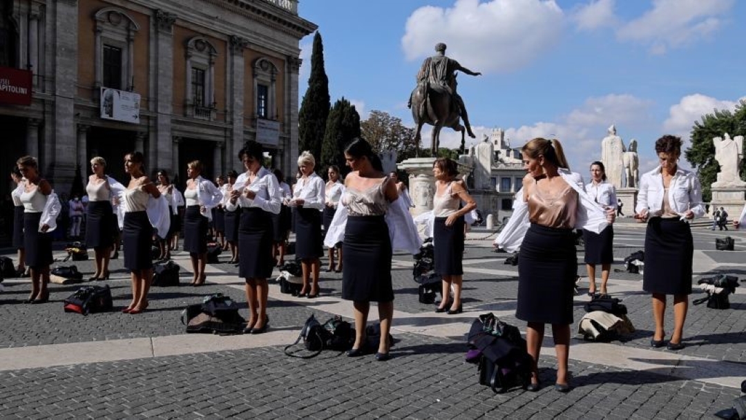 Abakozi ba Sosiyete yo mu Butaliyani ikora ubwikorezi bwo mu kirere ‘Alitalia’, bakoze imyigaragambyo rwagati i Roma biyambura imyenda mu ruhame kubera ikibazo cy’ubukungu kimaze iminsi kiri muri iyi kompanyi. Byatumye ihagarika ibikorwa byayo ku wa 14 Ukwakira 2021.
