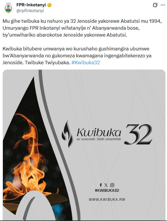 Ubutumwa bugira buti “Mu gihe twibuka ku nshuro ya 32 Jenoside yakorewe Abatutsi mu 1994, Umuryango FPR Inkotanyi wifatanyije n’Abanyarwanda bose, by’umwihariko abacitse ku icumu rya Jenoside yakorewe Abatutsi. Kwibuka bitubere umwanya wo kurushaho gushimangira ubumwe bw’Abanyarwanda no gukomeza kwamagana ingengabitekerezo ya Jenoside.