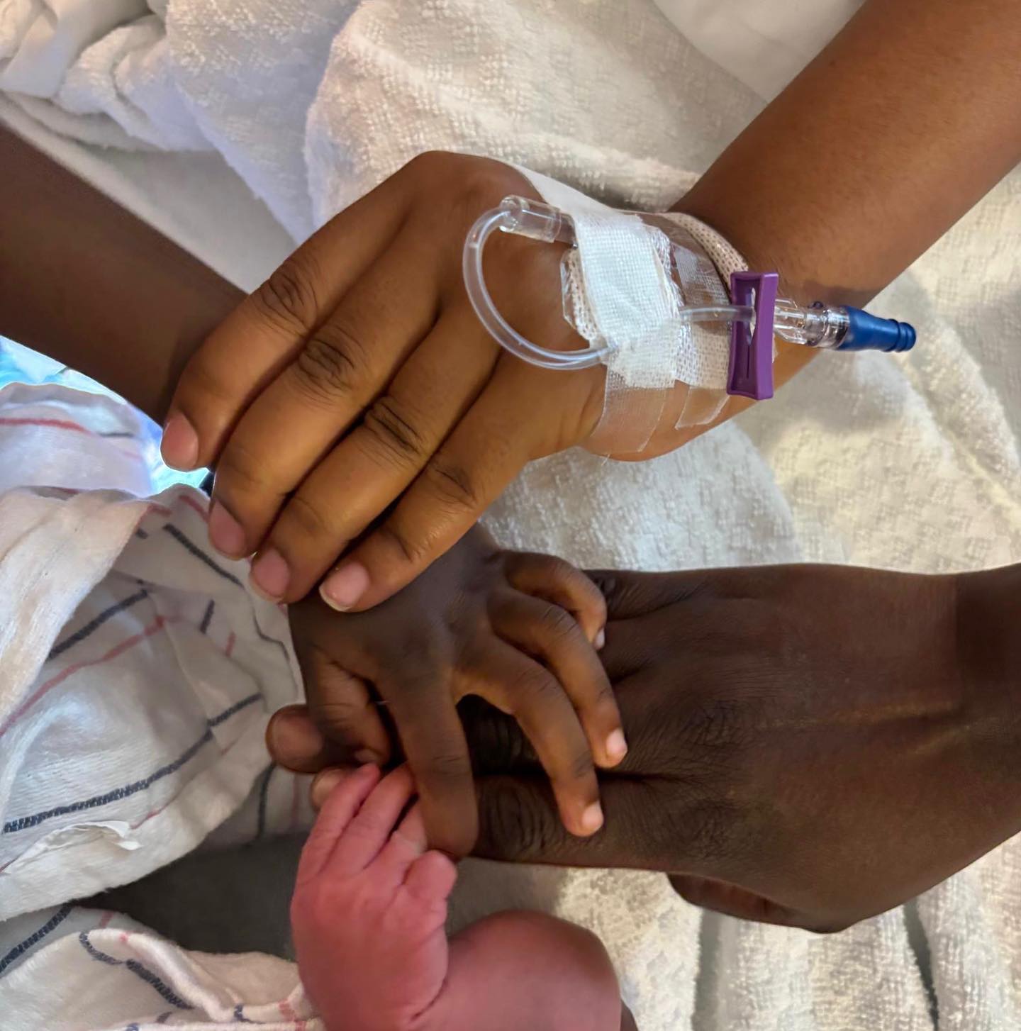 Ni ubutumwa buherekeje ifoto igaragaza ibiganza by’uyu muryango, icy’umuhanzikazi Clarisse Karasira, umugabo we ndetse n’abana babo barimo n’uru ruhinja.