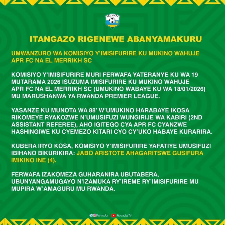 FERWAFA yahagaritse imikino ine umusifuzi wo ku ruhande witwa Jabo Aristote, wanze igitego APR FC yatsinze Al -Merrick SC mu minota ya nyuma y’umukino birangira amakipe yombi anganyije ubusa ku busa, ikintu benshi bavuze ko ari akarengane kakorewe APR FC nkana.