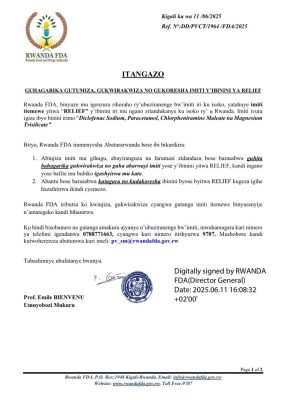 Itangazo rya Rwanda FDA ryo ku wa 11 Kamena 2025 rivuga ko bihereye mu igenzura rihoraho ry’ubuziranenge bw’imiti iri ku isoko, yatahuye “imiti itemewe yitwa “RELIEF” y’ibinini iri mu ngano zitandunye ku isoko ry’ u Rwanda.”