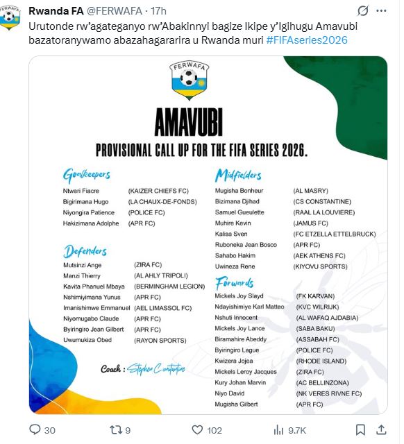 Amavubi, yatangaje 31 bazavamo 26 bazifashishwa mu mikino ya FIFA Series 2026 izaba muri uku kwezi kwa Werurwe 2026. Ni urutonde rutabonetsemo umunyezamu wa Rayon Sports, Kwizera Olivier ukomeje kugarukwaho bigakurura impaka.