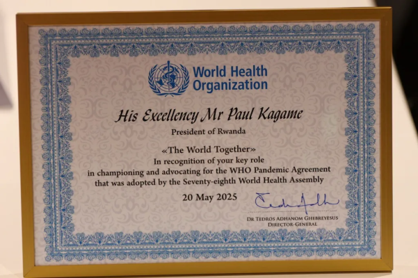 Perezida Paul Kagame yagenewe igihembo n’Ishami ry’Umuryango w’Abibumbye ryita ku Buzima (WHO) kubera uruhare mu miyoborere ituma Isi ishaka imbaraga zo guhangana n’indwara zidasanzwe zirimo n’ibyorezo.